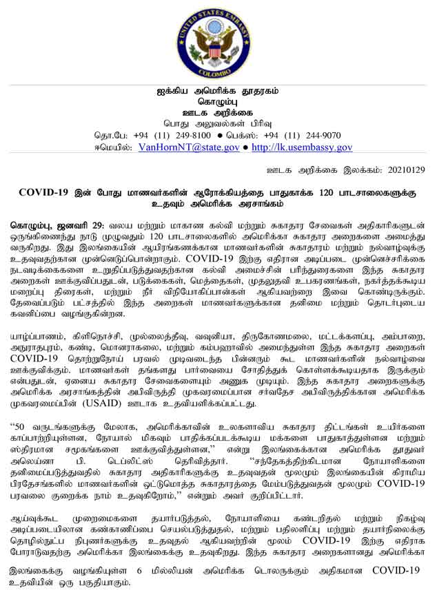 கொவிட்-19 இன் போது மாணவர்களின் ஆரோக்கியத்தை பாதுகாக்க 120 பாடசாலைகளுக்கு அமெரிக்க அரசாங்கம் உதவிகளை வழங்கி வருவதாக இலங்கைக்கான அமெரிக்க தூதுவர் அலெய்னா பி. டெப்லிட்ஸ் தெரிவித்தார்.